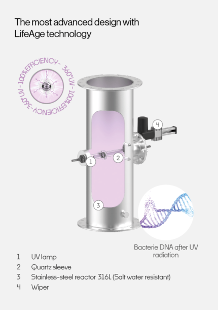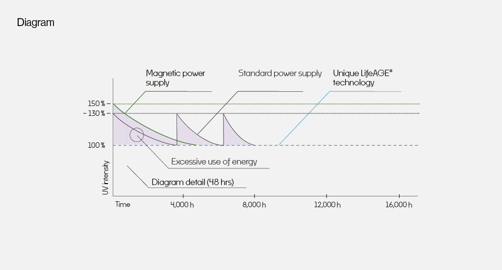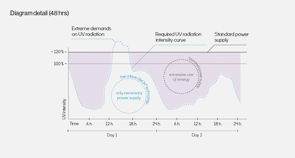 The magic lies in the dynamic release of energy needed to economically manage the intensity of UV radiation. The medium-pressure LifeUVM® system with the LifeAGE® technology emits UV intensity copying the minimum required radiation intensity curve. This system is autonomous and works in real-time. Therefore, it does not need to be connected to any external device that controls it to achieve this optimal intensity course. Therefore, the life of the UV lamp can be increased to up to 18,000 operating hours.