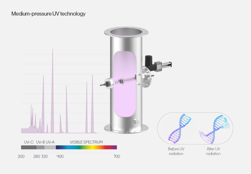 Medium-pressure UV systems—reduces pool chemicals, saves moneyMedium-pressure UV lamps operate on the broad-spectrum radiation principle, spanning from 200 to 600 nm. This broad range of wavelengths enhances their effectiveness by increasing the number of pathogens they can target. Furthermore, this broad-spectrum UV radiation permanently disrupts the DNA of microorganisms, preventing any possibility of DNA repair and reactivation.