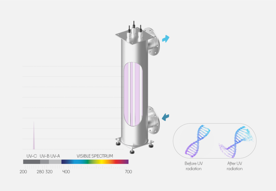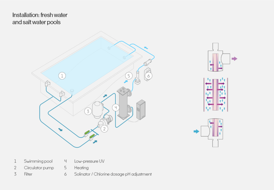 Low-pressure UV (UVL) systems emit UV-C light at 254 nm, which disrupts the DNA of microorganisms, preventing their replication. Installed after the filtration unit, the reactor disinfects the water as it flows through. UVL systems are effective for bacterial and viral inactivation while reducing chemical use, making pool water safer and clearer.