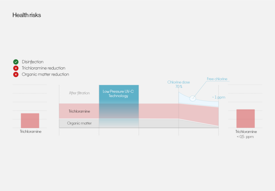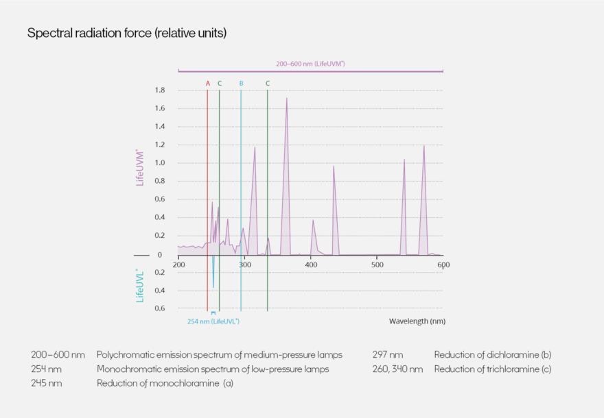 It effectively treats water but does not remove trichloramine. For trichloramine removal, we recommend using a medium-pressure UV system.