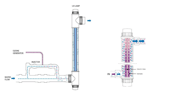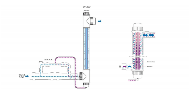 Ozone is generated in the air by UV radiation in the space between the UV discharge lamp and its quartz shell. The amount of ozone generated depends on the humidity of the air from which the air is drawn into the UV lamp. From there, ozone is sucked into the water using an injector. Water with ozone bubbles passes around the UV lamp, where a partial AOP process occurs. Due to the bubbles in the water, not all generated ozone is used in the AOP process. Bubbles pass further into the piping system and may cause noise. Bubbles also enter the pool. If they contain ozone residues, they create an unpleasant odour above the surface, and the environment can be hazardous to health.