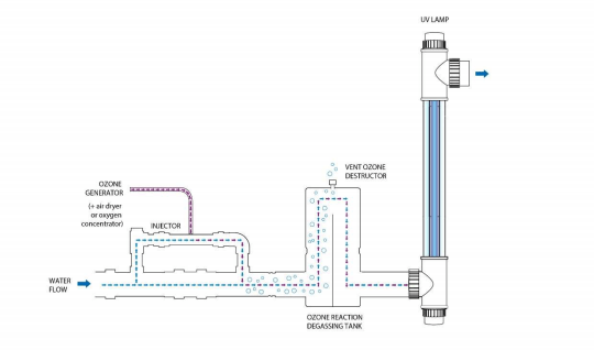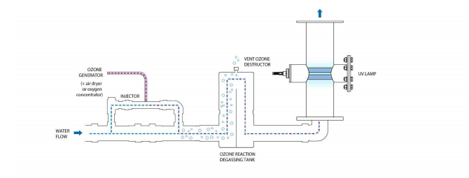 b) In order to make maximum use of the generated ozone, it should be dissolved into the treated water as effectively as possible before the dissolved ozone water reaches the UV reactor. This requires an injector which adds ozone to the treated water and a reaction/degassing tank. This ensures maximum transfer of ozone into water and at the same time serves to remove undissolved ozone into the ozone destructor in the off-gas to prevent ozone from entering the environment.