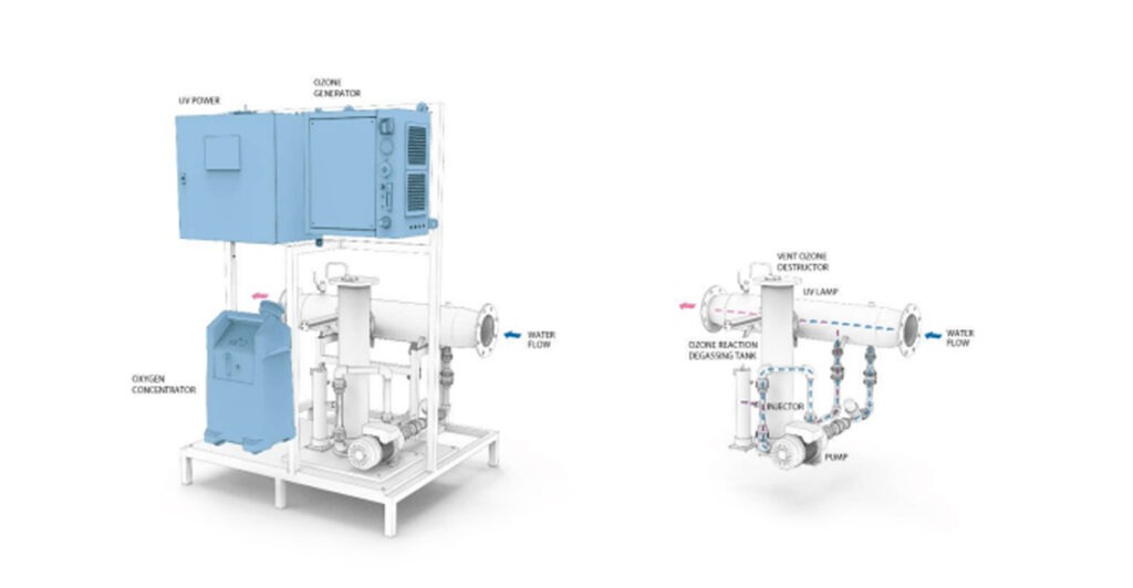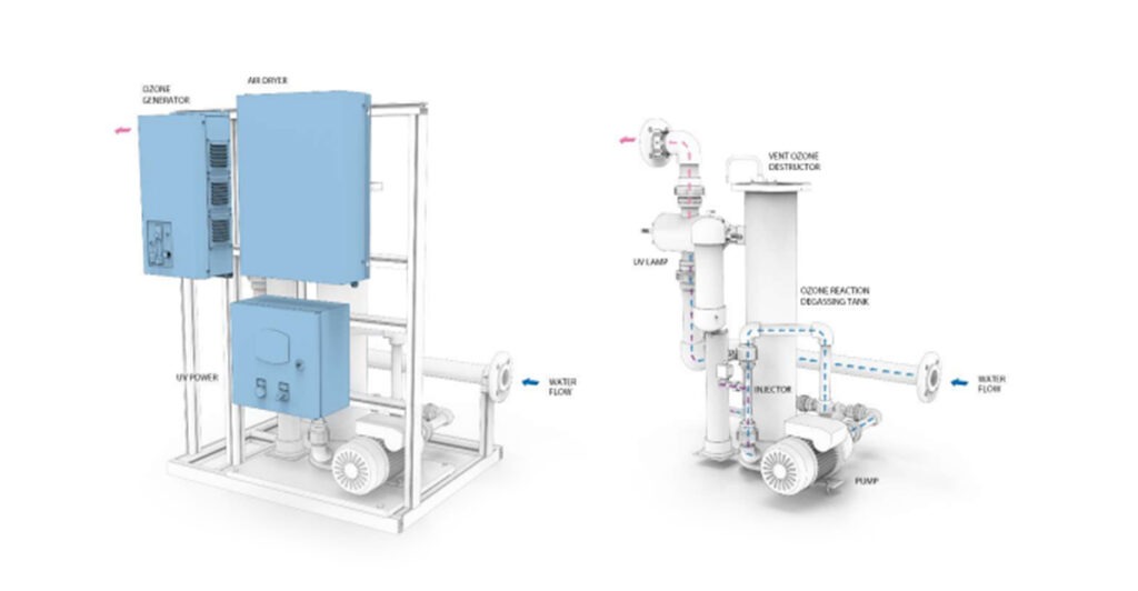 Ozone is generated here from dry air, thanks to the installation of an air dryer or oxygen concentrator. Part of the water from the main flow is sucked by the booster pump into the injector, where the water is mixed with ozone. In the reaction and degassing tank, ozone is dissolved in water, and the undissolved ozone gas is discharged to the ozone destructor in the off-gas. From the reaction tank, water with dissolved ozone is released without bubbles. Ozonized water enters a stainless steel UV reactor with a low-pressure UV lamp, where the AOP process occurs. Water without dissolved ozone is leaving the UV reactor. In the Combi Ozone/UV, water is treated with three technologies: ozone, low-pressure UV systems, and the AOP process.